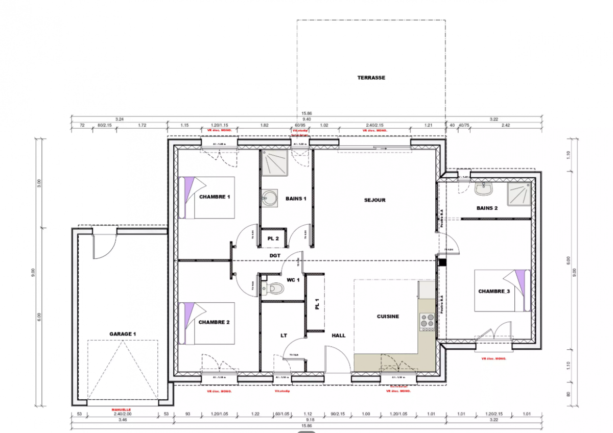 Trois chambres confortables accueillent l’espace nuit, complété par deux salle de bain avec WC pour un confort au quotidien.