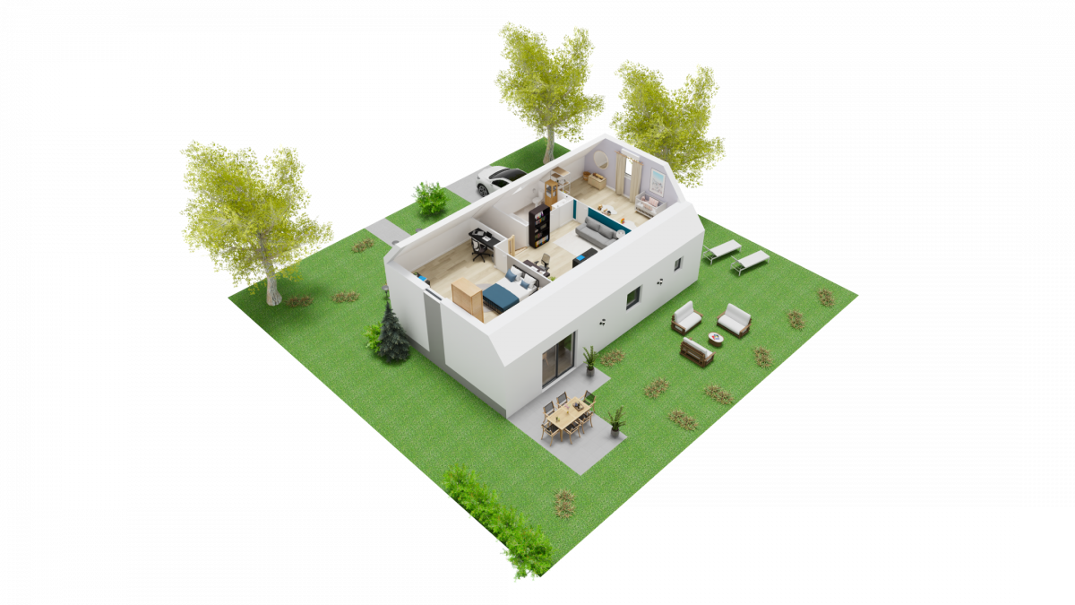 Exemple de maison à bâtir aux dernières normes RE 2020 d’une superficie de 105m² habitable avec garage accolé sur un terrain de 800 m² idéalement situé sur la commune de Bosguerard.