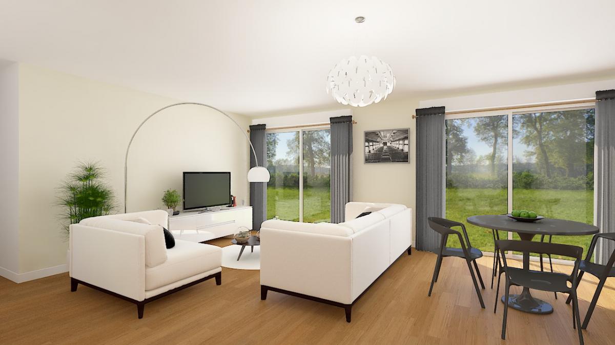 Pièce de vie lumineuse (43 m²) : Espace ouvert sur la cuisine avec une grande baie vitrée donnant sur votre futur jardin.